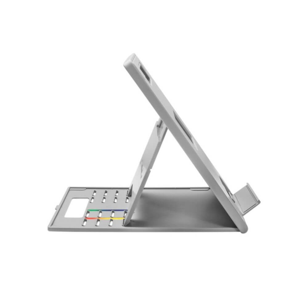 I piedini antiscivolo impediscono lo scorrimento in avanti della base, gli inserti imbottiti garantiscono una tenuta sicura del dispositivo e il design pieghevole e sottile la rende facilmente trasportabile. Da utilizzare con tastiera e mouse esterni (venduti separatamente). Supporta laptop e tablet fino a 14″.