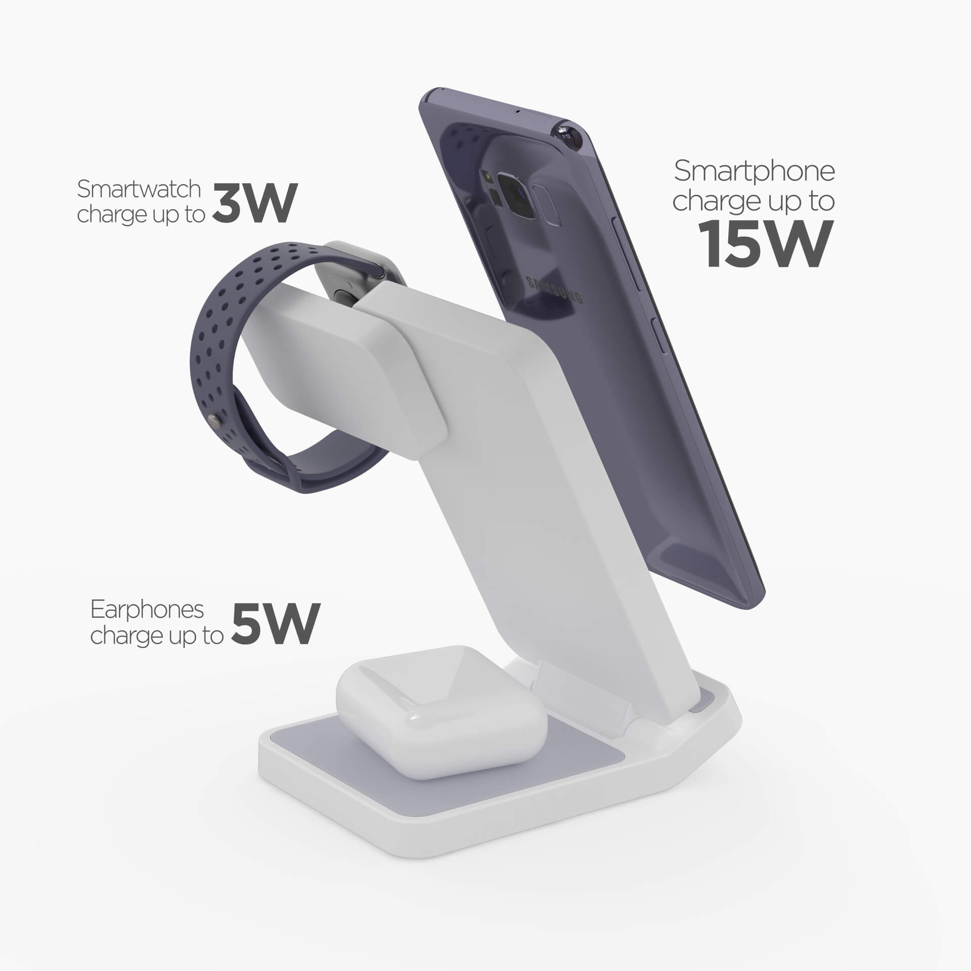 Con questa dock station, puoi ricaricare contemporaneamente fino a 3 dispositivi wireless: smartphone (15W), Apple Watch (3W) e AirPods (5W), oltre ad altri dispositivi.